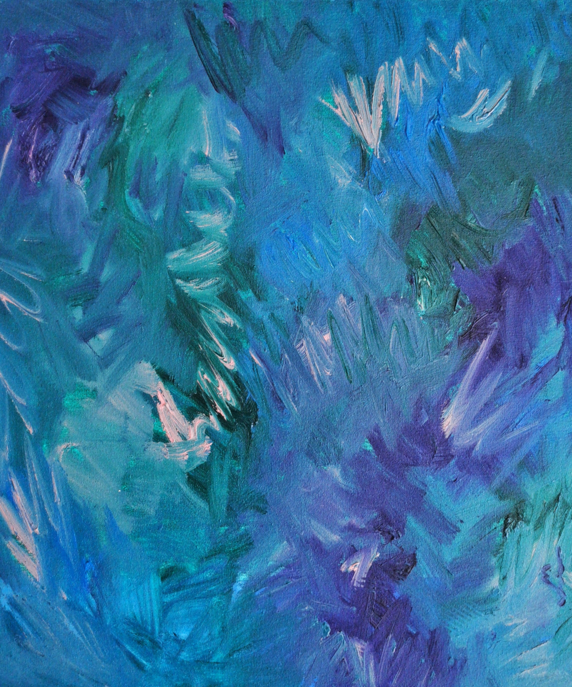 Painted in moody shades of dark green, deep violet, midnight blue, and touches of peach and buff grey, the work reflects the mysterious space at the heart of the forest—where only tiny glimmers of evening sky peek through the dense canopy.