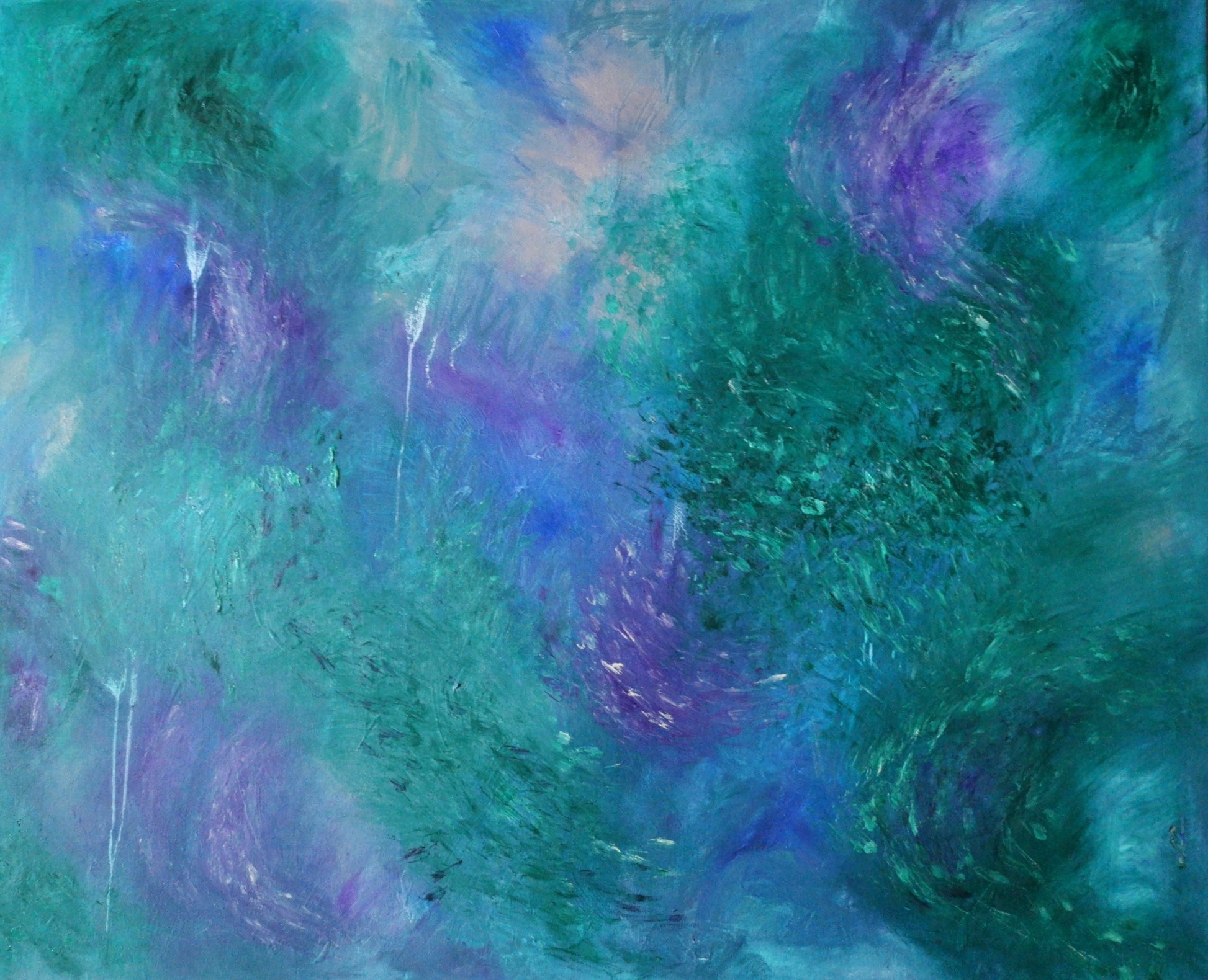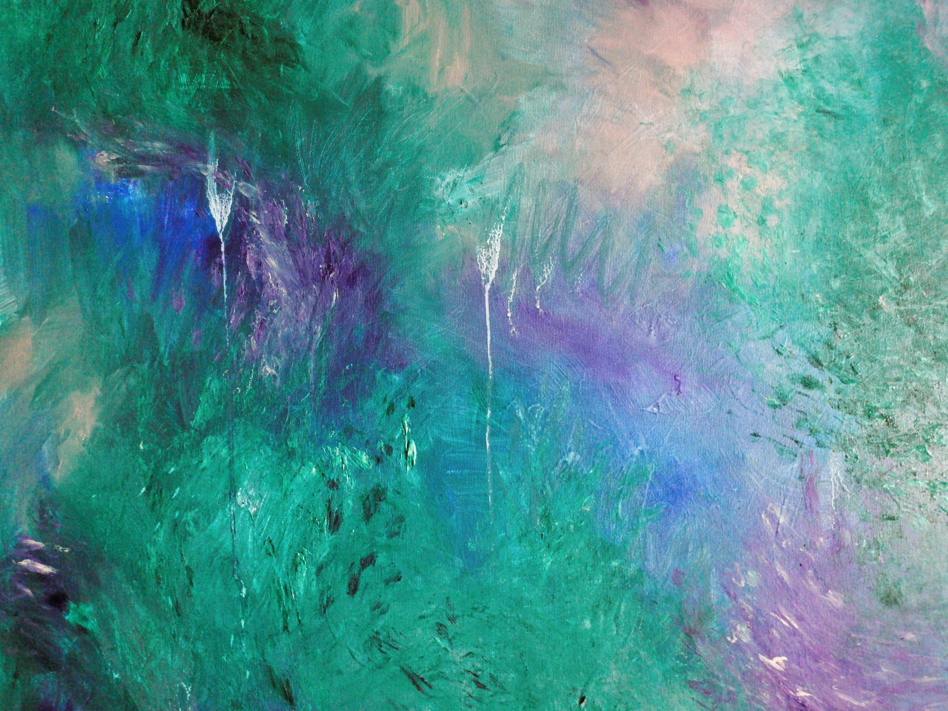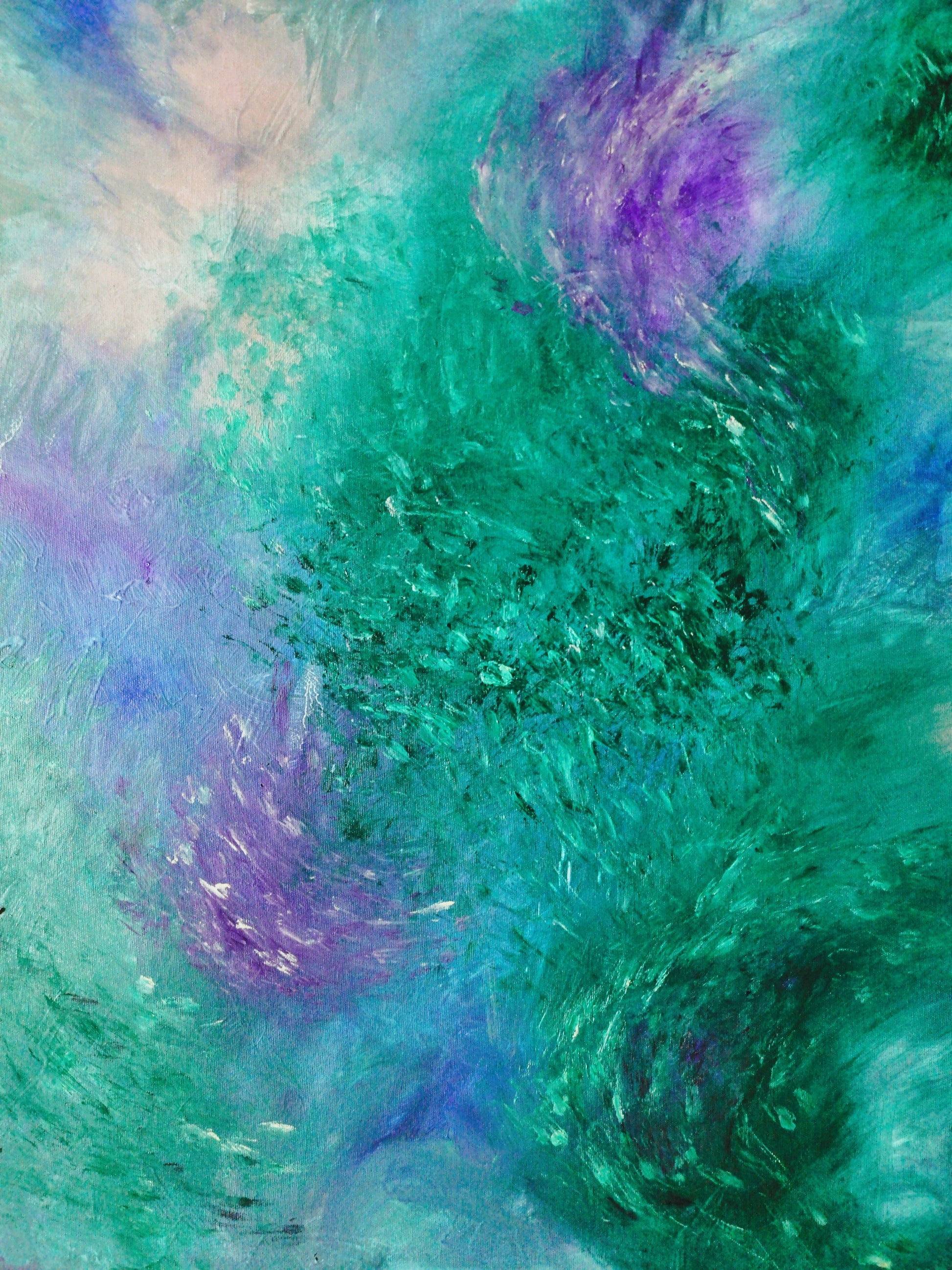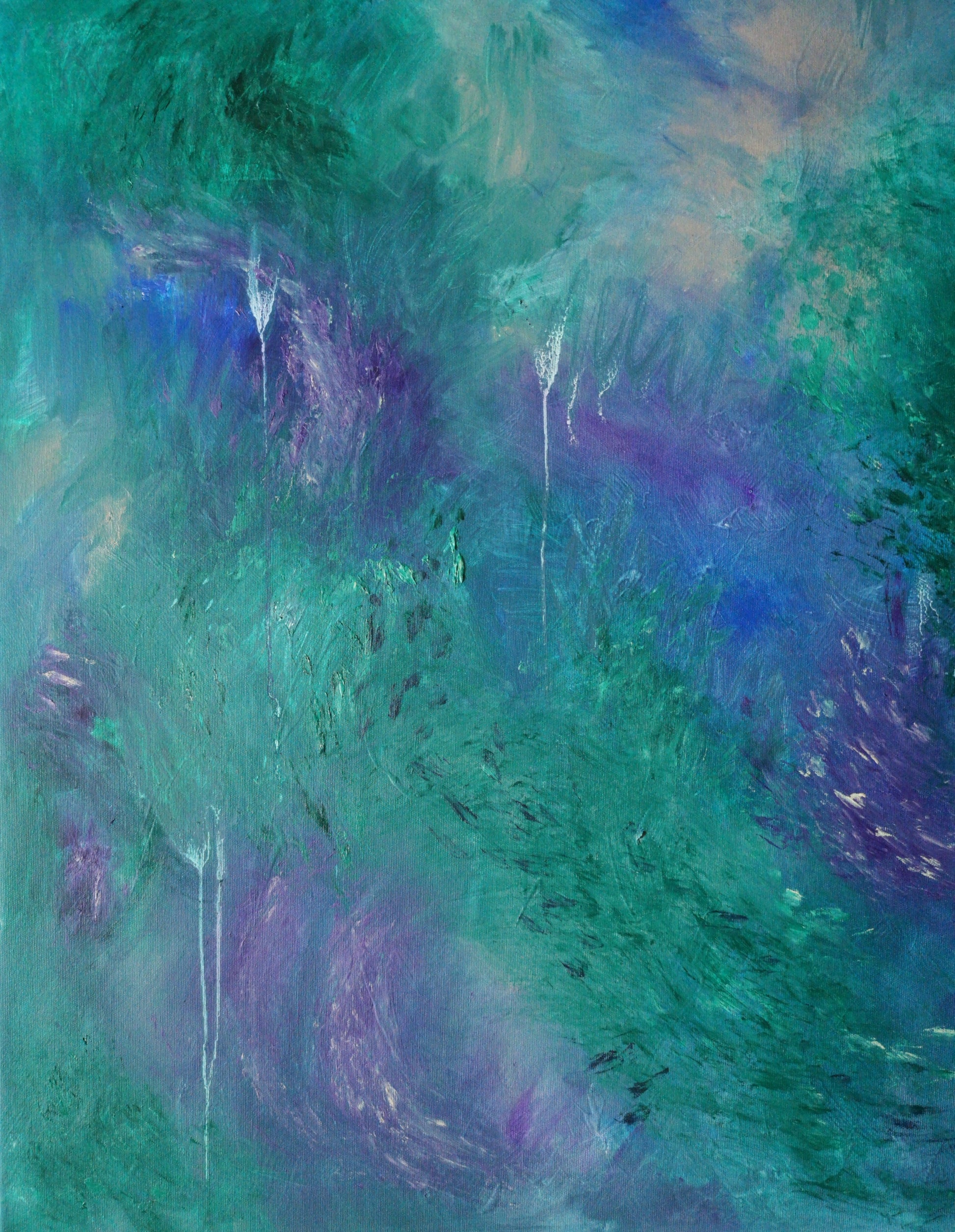 "Evenings in the Mythical Forest" captures more than just a visual scene—it’s an emotional atmosphere, a sensation translated into color and movement. Through layered tones of phthalo green, soft peach, buff grey, blue, and violet, this painting evokes the cool, damp, fresh, almost tangible evening air inside a dense, living forest.