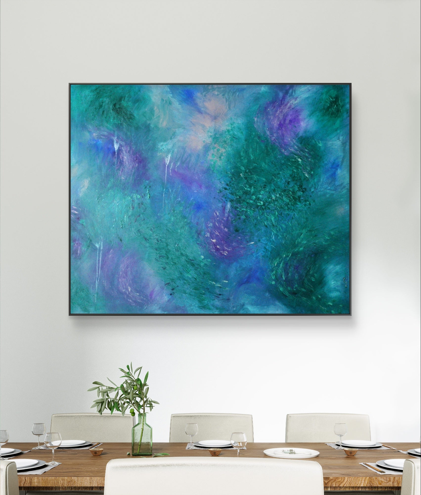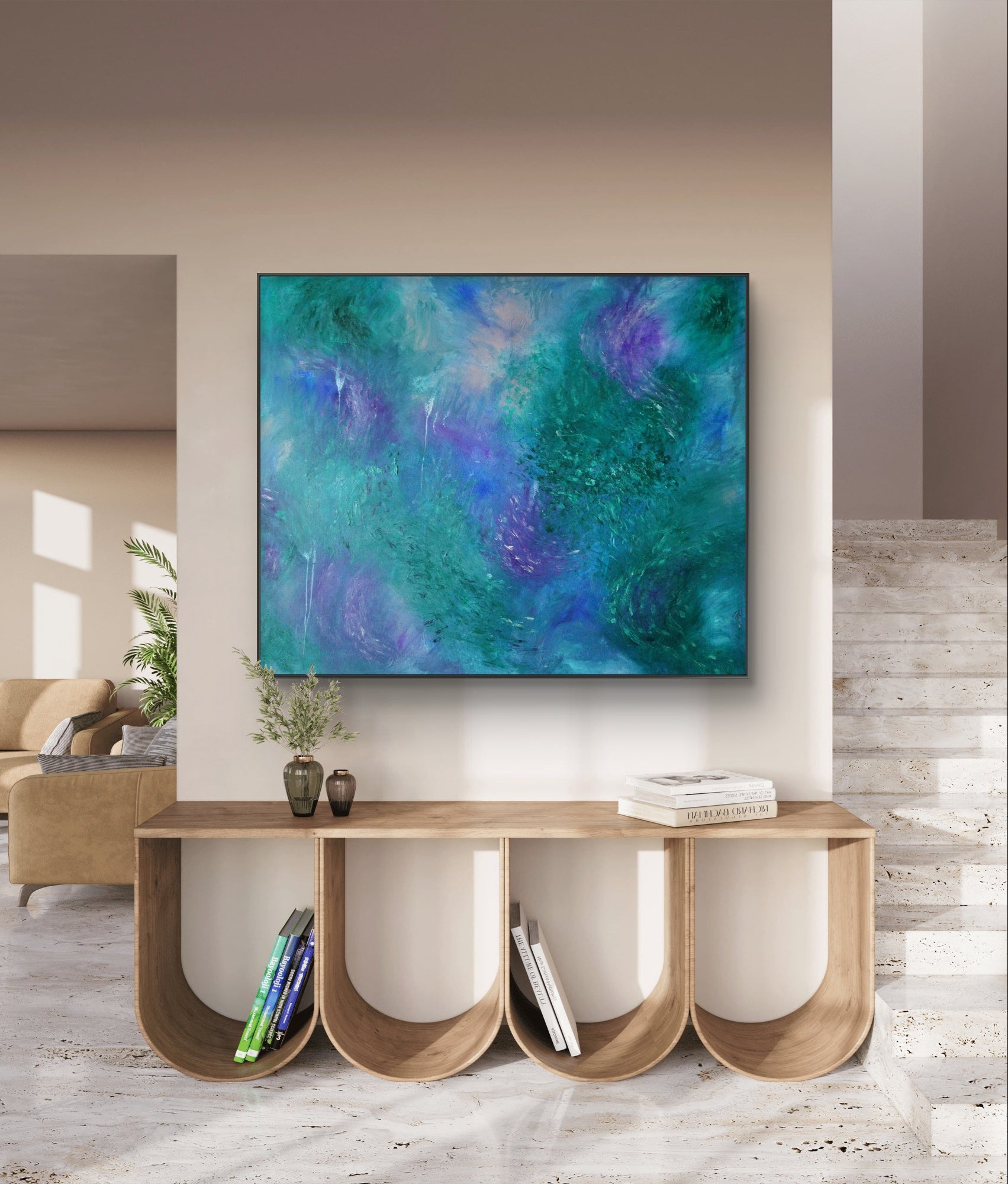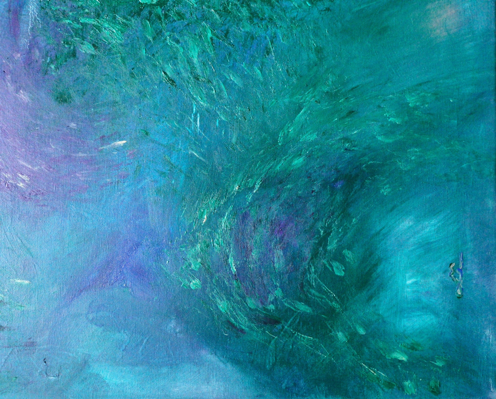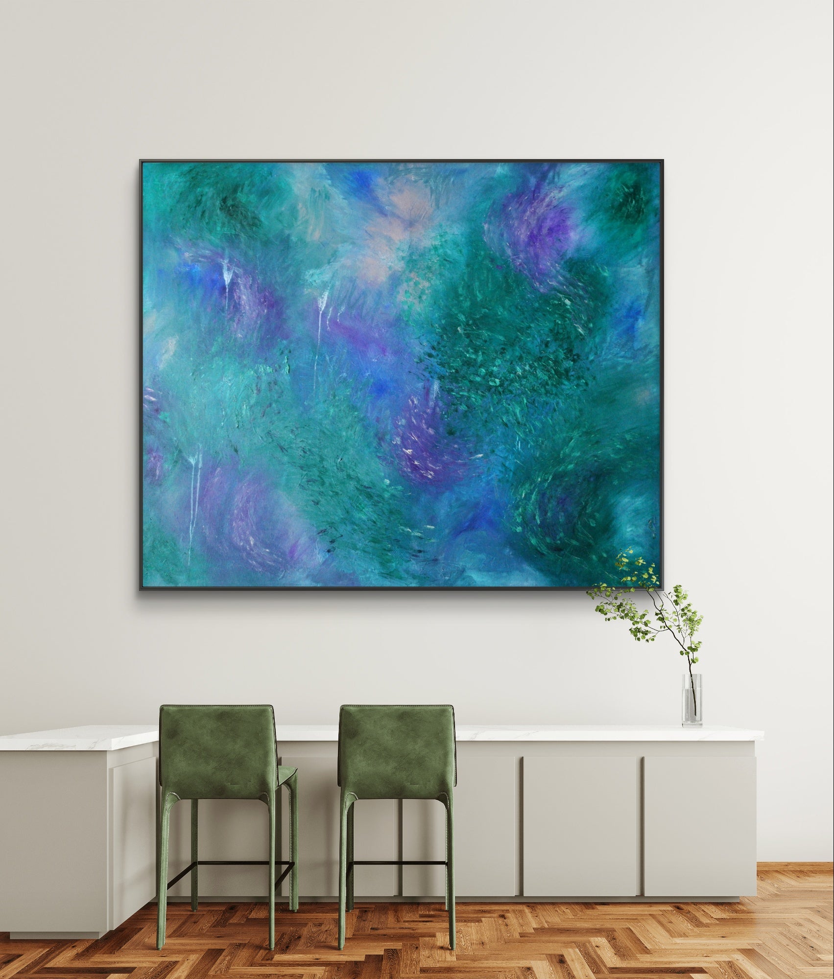 "Evenings in the Mythical Forest" captures more than just a visual scene—it’s an emotional atmosphere, a sensation translated into color and movement. Through layered tones of phthalo green, soft peach, buff grey, blue, and violet, this painting evokes the cool, damp, fresh, almost tangible evening air inside a dense, living forest.
