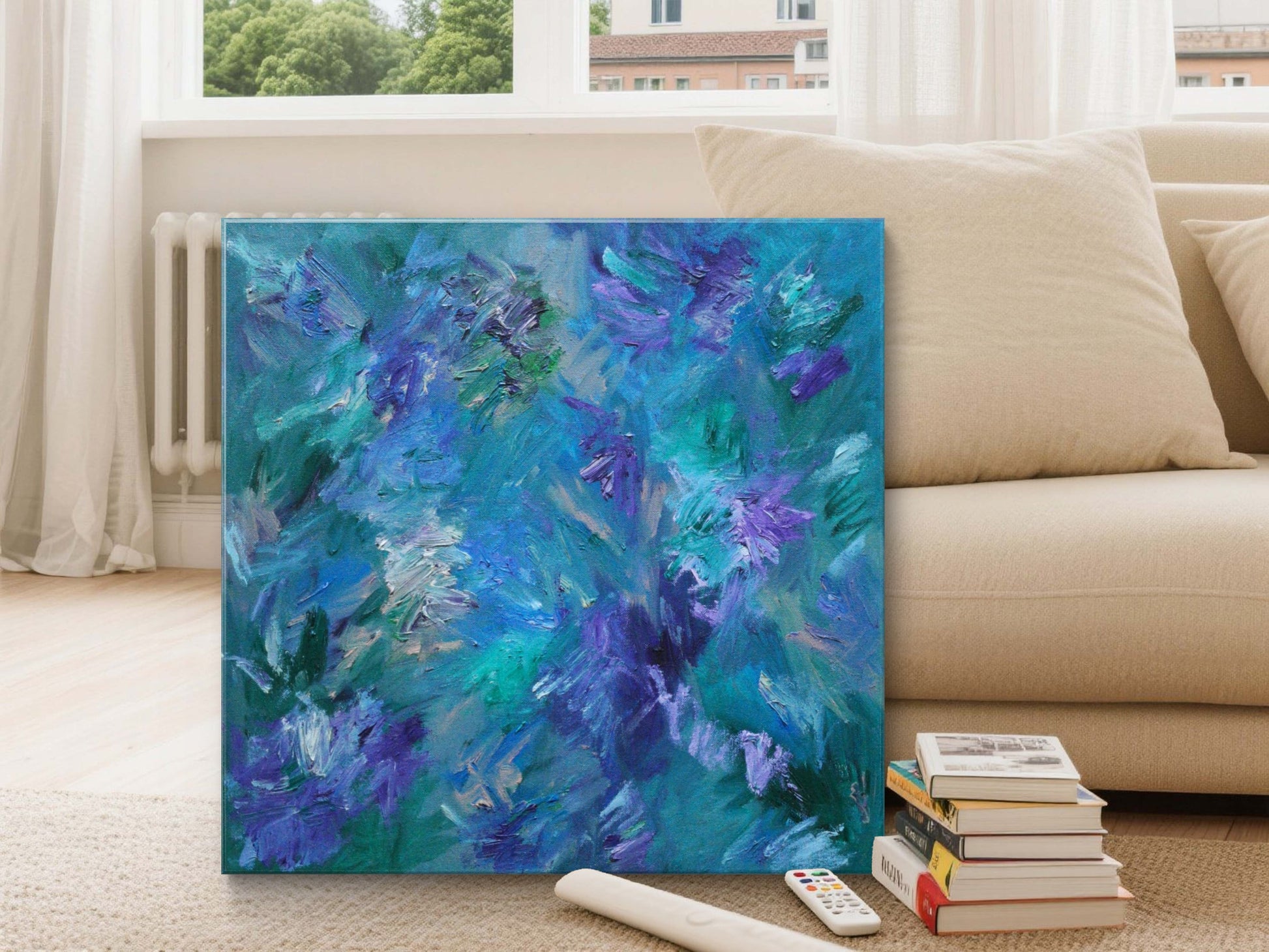 “Flowers in the Wind” continues my Mythical Forest series, a collection inspired by the untamed magic of nature. This oil on canvas captures the gentle yet powerful motion of flowers swaying in the forest breeze. Shades of deep green and blue create a lush backdrop, while bright accents of purple, pink, and cream shimmer like fleeting moments of joy in the wild. A piece that invites serenity and movement into any space.