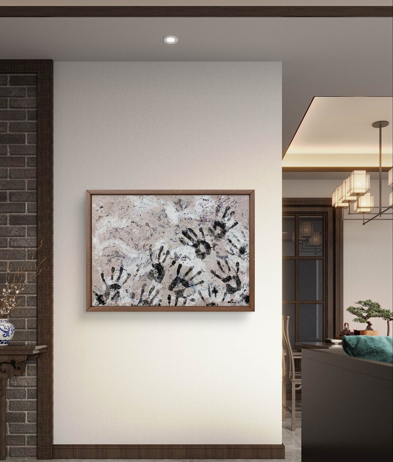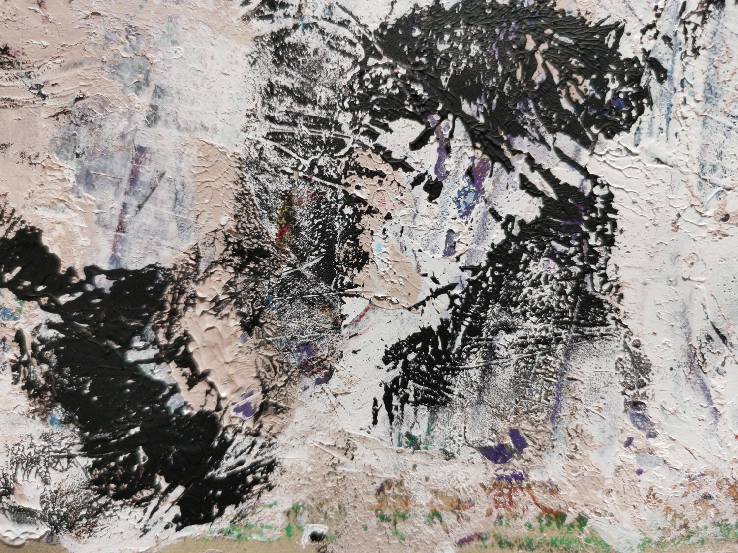 I covered the surface with layers of white and beige gesso, allowing fragmented memories of the original work to peer through, like echoes beneath snow. Then came the hands—my own, dipped in black acrylic—pressed and re-pressed onto the surface in a spontaneous gesture meant to represent the artist’s imprint on the evolving piece.